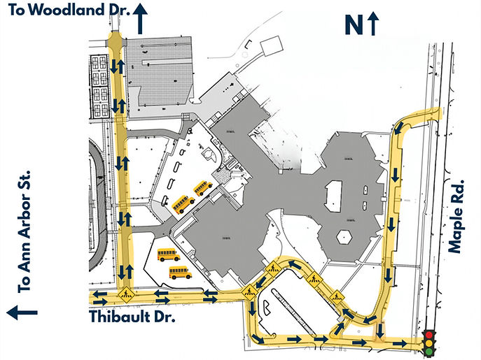 Please see below for the new traffic pattern for Saline Middle School and Saline Area Senior Center. Please use the new road on Woodland Drive or enter off of Ann Arbor St.